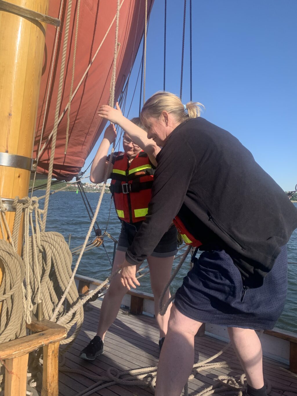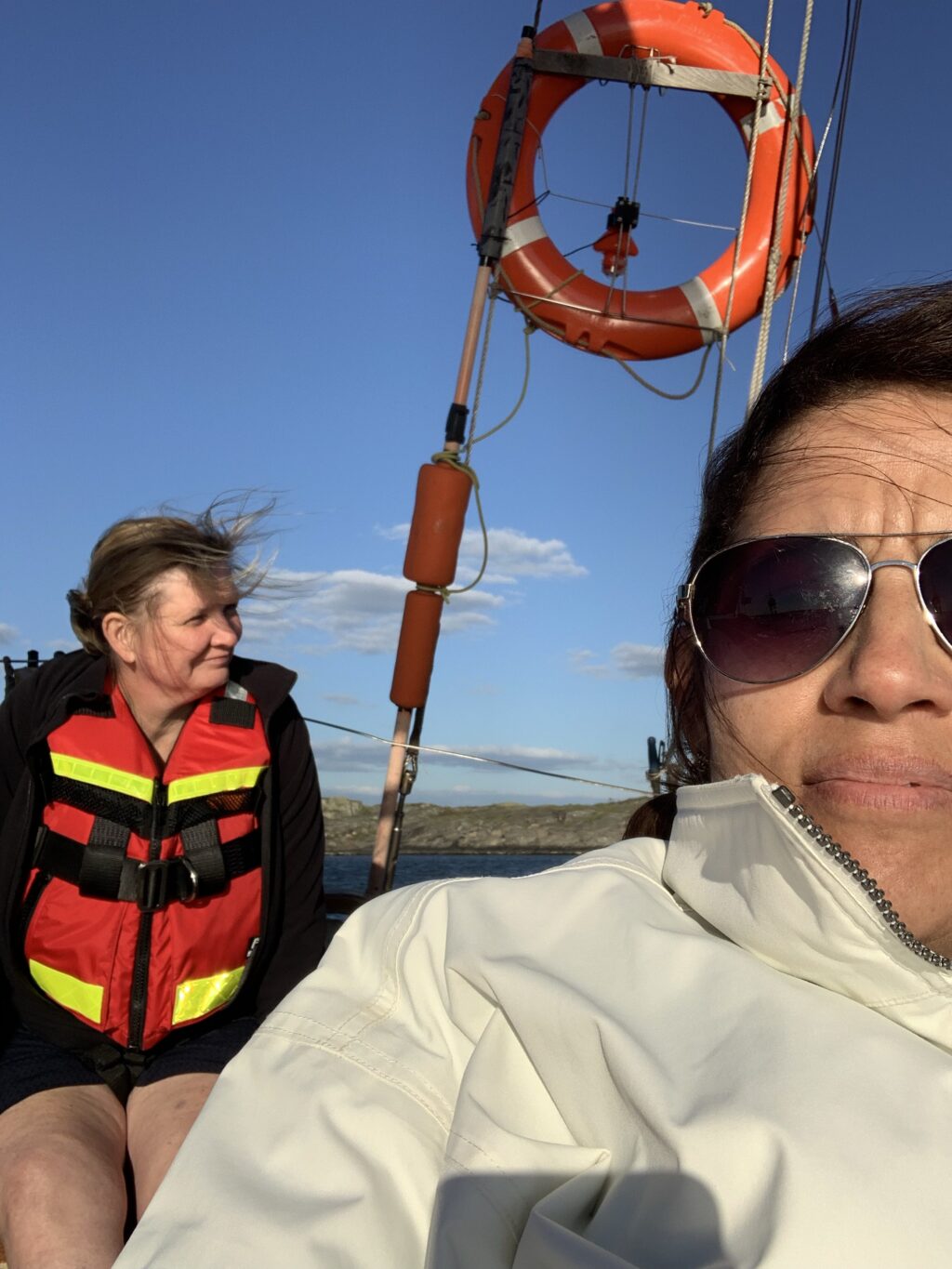 Hissa storseglet!Skota hem!Gabbe the sailor!Snart blir jag illamående…Storbystade? Nä flytvästade!Gunilla trivs på båten!Våra digitala scouter försöker nås men mottagningen är som bortblåst!Å hej Fernanda!Bad hair day🤣Snedsegling for real. Håll i, det lutar!Cleanpipe the ultimate vindstopper!Båt i sikte, be aware here comes Stena Line!Stena Danica drog förbi väldigt snabbt.Nu börjar det kännas mer…⛵️💦👂Gunilla o Hanna in action…Made for this…Gabbe styrman. Hemma igen på norra älvstranden